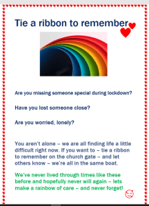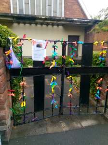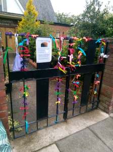 As the weeks went by, I wondered if there was anything we could do to reach out to people in our community – and I thought about a project I’d heard of involving ribbons. I thought we could probably adapt it to our situation in Billingham. So I bought a rainbow of ribbons, made some drawstring bags to hang on the gates, made a couple of notices, and waited to see what would happen.