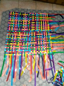 I brought the ribbons home – there were 285 on the 2 gates. So began the task of making them into some kind of banner. I ironed the creases out of them, got some material to use as backing – and began weaving them.